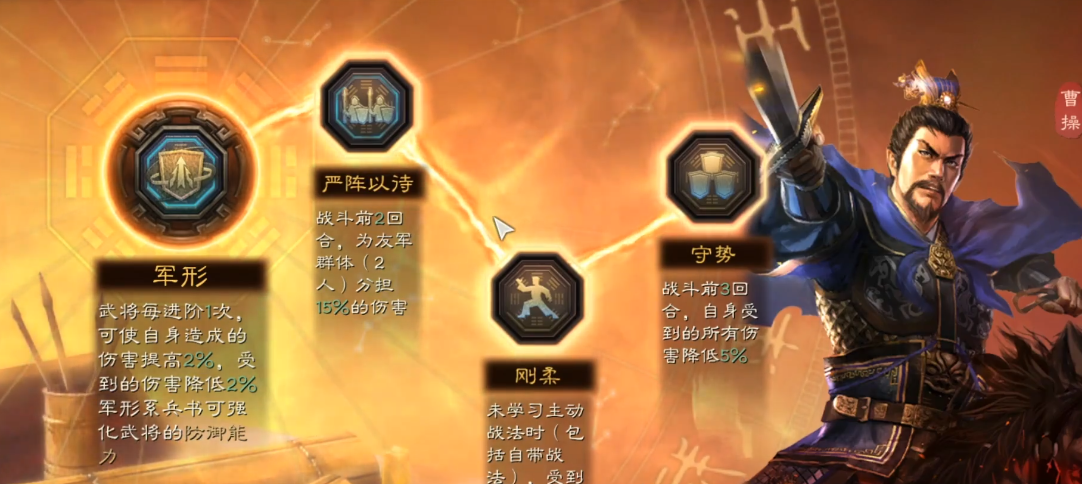 兵书体系采用九变路线强化战场韧性。严阵以待+静心组合使曹操分担15%友军伤害并降低自身受谋略伤害,契合其高统率特性;若侧重续航则选作战系胜而益强+无功而励,普攻后概率恢复兵力且免疫混乱时额外回血。装备选择遵循防御优先原则,倚天剑配白银铠形成物理减伤组合,或搭配风神盾提升全防御能力。宝物附加属性以统率、智力为优,确保双防平衡,不推荐追求武力加成。