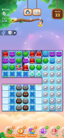 咱们得从上面开始突破,优先做出竖直特效来清理挡路的毛球和下层冰块,让动物们能顺利掉下来。这一步挺关键的,先把上面的活动空间打开,后面的操作才会顺畅。毛球分棕灰两种,棕毛球得用竖直特效打两次才会变灰,灰毛球就简单多了,普通消除也能搞定。观察好开局布局,把力量用在最需要的地方。