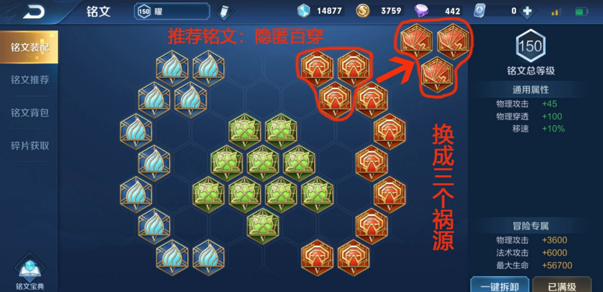 铭文与出装需围绕物理穿透、冷却缩减及生存能力构建。百穿铭文是核心选择,即红色异变、绿色鹰眼各10个,提供29点物理攻击与100点物理穿透,强化前期压制力。蓝色铭文搭配10隐匿,补充10%移速优化支援与追击效率,普攻衔接更流畅。若敌方控制密集或阵容偏肉,可将部分隐匿替换为调和提升韧性,或加入红月改善攻速阈值手感,但会略微牺牲穿透属性。