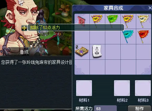 一切准备就绪后,直奔长寿村找鲁成开始制作吧。制作过程分两步走:先用活力和他对话选择合成家具设计图,根据配方放入对应材料,这一步有概率失败,成功的话一次能拿到两张设计图;拿到设计图别放包里积灰,右键点击它消耗体力就能把图纸变成实实在家具了。这里有个小经验分享,合成设计图时心态放平,失败很正常,连着三次没成的话不妨换个配方试试,或者干脆歇会儿再继续。