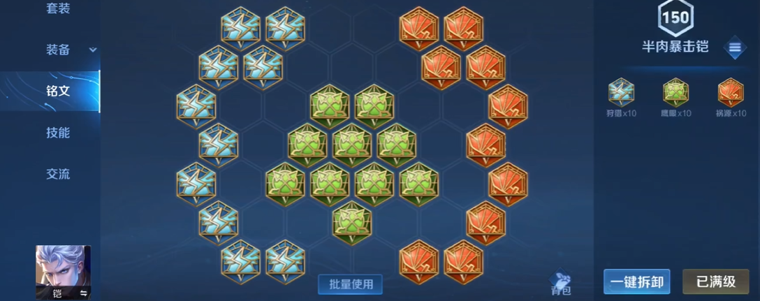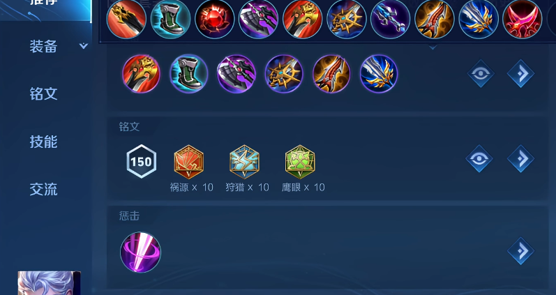 暴击输出流推荐10祸源、10鹰眼、10狩猎,祸源提供高额暴击率提升爆发潜力,狩猎的移速和攻速优化追击与连招手感,鹰眼则增强物理穿透确保伤害有效性。若偏向对抗路半肉承伤,可选择10异变、10鹰眼、10隐匿,异变与鹰眼组成百穿铭文强化技能基础伤害,隐匿的物理攻击和移速加成提升机动性。部分对局也可混搭3无双与7祸源,兼顾暴击效果与稳定性。