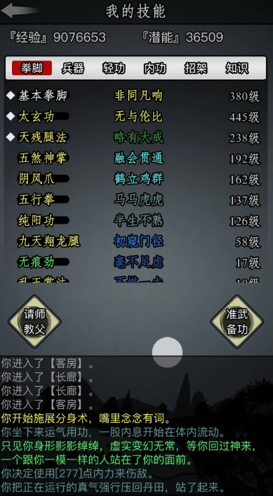 纯阳功与太玄功作为放置江湖中两类高阶内功,其核心差异在于定位与适用阶段。纯阳功属江湖书页武学,需通过第五章华山村玄坛庙、第十五章苏州城胡同及第二十五章长安城钟楼的连续剧情任务,击败特定NPC概率获取喜怒哀乐四部件合成,整体流程跨章节且概率偏低。其核心优势为40%的高潜能转化效率,能快速提升基础拳脚等级,对散人玩家或华山派等门派前期过渡价值显著,可同时装备于内功与拳脚位,但属性加成较为单一。太玄功则属侠客岛传承武学,主要通过古寺协作任务、第二章恶人村老乞丐、第六章逍遥林强盗头目等章节的BOSS战随机掉落碎片或秘籍,依赖重复挑战积累。其潜能转化率为30%,虽略低于纯阳功,但具备全面均衡的12项战斗系数,涵盖攻击(系数85)、防御(系数90)、加力伤害(系数80)等关键属性,属于攻防兼备的万金油型内功。