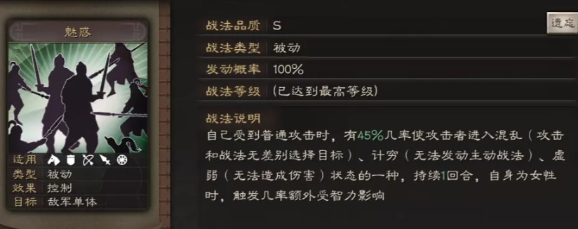魅力属性虽不直接作用于战场输出或防御,但部分战法效果与魅力存在隐性关联。例如传承战法魅惑的触发概率与控制成功率,可能受施法者魅力值影响;拥有高魅力的辅助型武将可强化团队增益类战法的稳定性,尤其在配合治疗、减伤等辅助技能时,能间接提升队伍生存能力。这种机制使得魅力属性在特定阵容构建中具有战术意义。