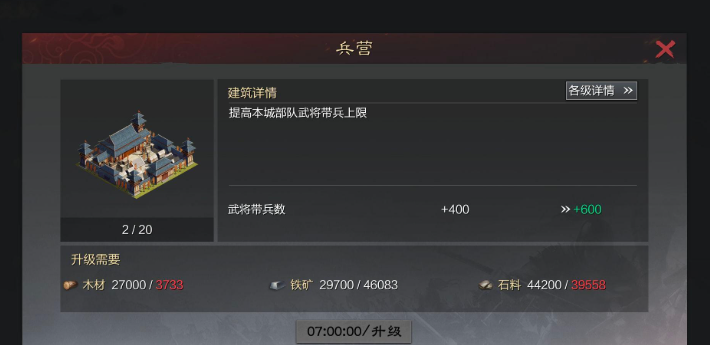 校场与其他军事建筑的协同发展也是快速提升战力的重要一环。例如兵营每升一级能提高单个武将的带兵上限,而校场增加部队数量,两者结合可以让你在总兵力上获得巨大优势。同时,统帅厅的升级能让部队配置前锋,进一步增强单支部队的战斗力。在资源有限的情况下,需要合理规划校场与兵营、统帅厅等建筑的升级顺序,通常建议在校场达到基础等级后,优先提升兵营来强化单队实力,再回头继续升级校场以扩大部队规模。这种循序渐进的方式能帮助你在资源消耗和战力成长间找到平衡。