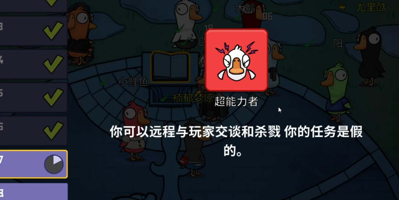 超能力鸭是鸭子阵营中的独特角色,拥有读心和远程精神锁定的能力。超能力者可以读心,能够听到玩家内心抱怨自己的软弱,每一次抱怨都如同刀割般难受。当他们决定反击时,可以使用精神入侵技能锁定另一名玩家,启动一个倒计时过程,最终导致目标死亡。在锁定期间,超能力鸭可以与目标玩家进行私密对话,这种对话其他玩家无法听到,为策略交流提供了隐蔽渠道。锁定目标后,超能力鸭会经历一个分阶段的行动限制,前段可以自由移动,后段则进入定身状态,视角会强制追随被锁定玩家,直到技能完成。