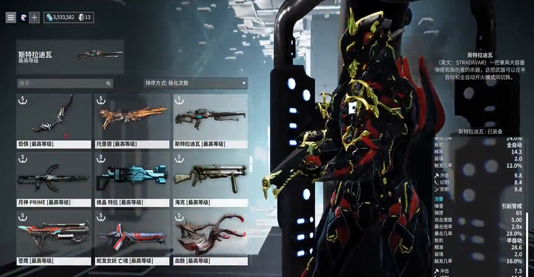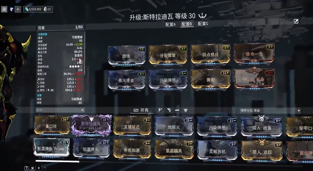 斯特拉迪瓦的整体射击手感较为优秀,后坐力小,操控性良好。在配卡上,由于其暴击与触发数值都具备一定的开发空间,采用融合了基础伤害、多重射击、双暴与触发几率调整的双修配卡方案是较为常见的选择,同时提升其暴击输出的期望值与异常状态的触发频率。如果玩家拥有为其定制的裂隙MOD,则可以替换掉部分标准配卡,进一步强化其优势属性,例如提升多重射击或射速,从而显著改善实战体验与输出效率。