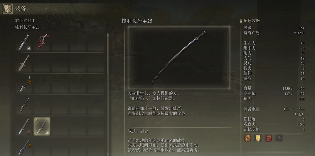 除了名刀月隐,月影太刀也是一把值得考虑的居合武器,其战技同样以居合斩为核心,拥有出色的伤害输出与削韧效果。玩家在选择居合武器时,应重点关注武器的属性加成是否与自身构建匹配。大部分的太刀类武器更依赖灵巧属性,而名刀月隐、月影太刀等则同时需要可观的智力投入,这对于追求混合伤害的玩家更为合适。也要留意不同居合武器战技的具体形态与消耗,例如有的侧重于单次强力突刺,有的则可能具备多段攻击效果。