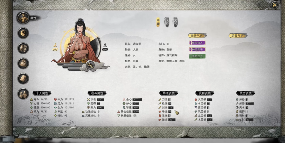 先天气运的选择对角色开局发展至关重要,它直接影响角色的初始属性加成和长期成长潜力。先天气运按照稀有度分为白色、绿色、蓝色、紫色、橙色和红色六个档次,其中红色品质提供最强大的属性加成。玩家应优先考虑提升核心属性如攻击力、悟性、幸运和魅力的气运,因为这些属性关系到战斗效率、技能学习速度和资源获取能力。高品质先天气运能为修仙之路奠定坚实基础,避免在早期阶段陷入被动。