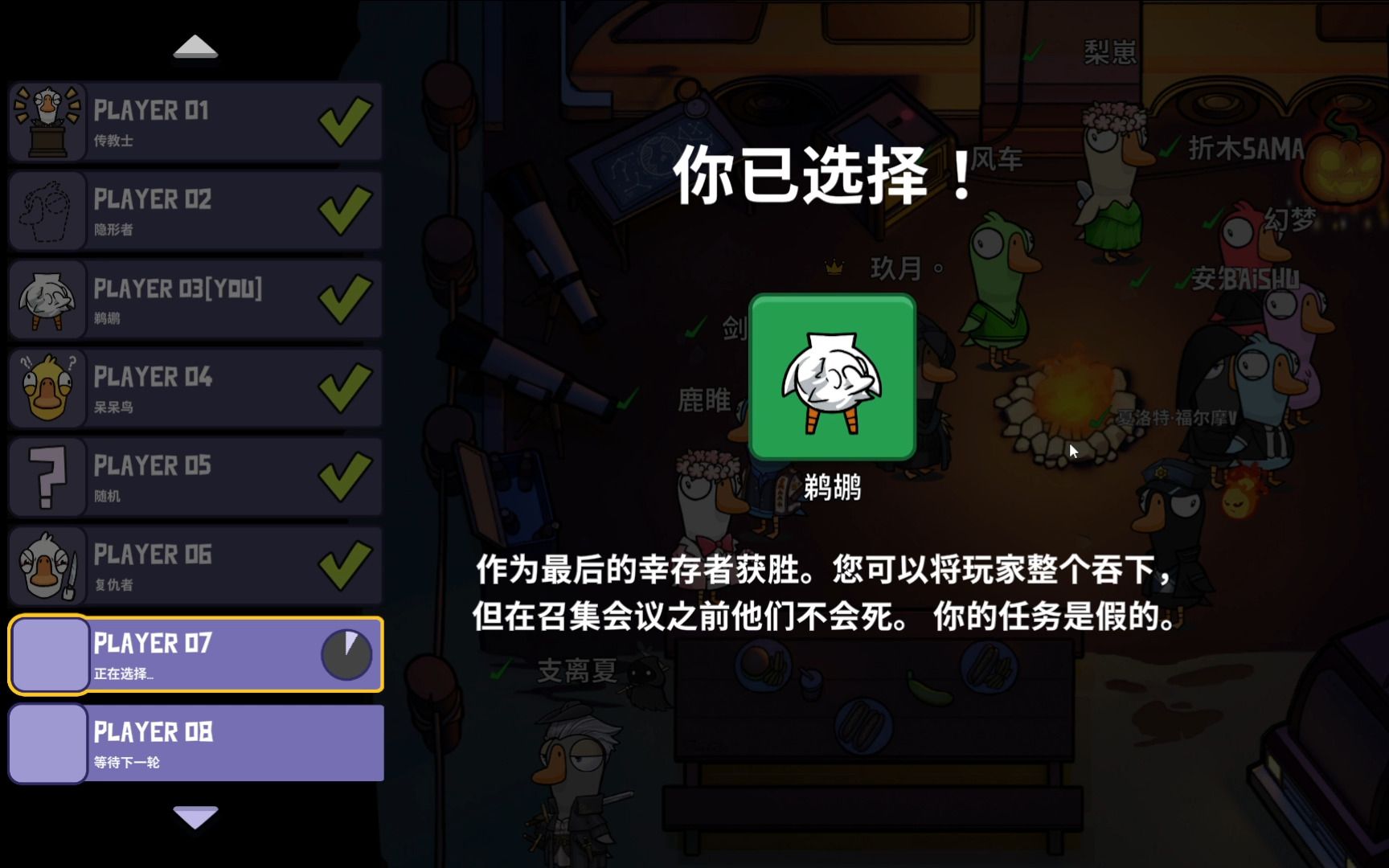 穿雾仅限定鸭阵营多数角色、中立阵营鸽子与好人阵营模仿者可触发,普通鹅类角色无法进入。游戏界面左下角设有切换按键,可控制角色能否穿雾,雾区外玩家能听到雾内特定音效。丛林地图迷雾常刷新在祭坛、瀑布、神庙周边,出现前伴随风声提示,进入后好人视野大幅受限,鸭阵营角色视野更清晰。